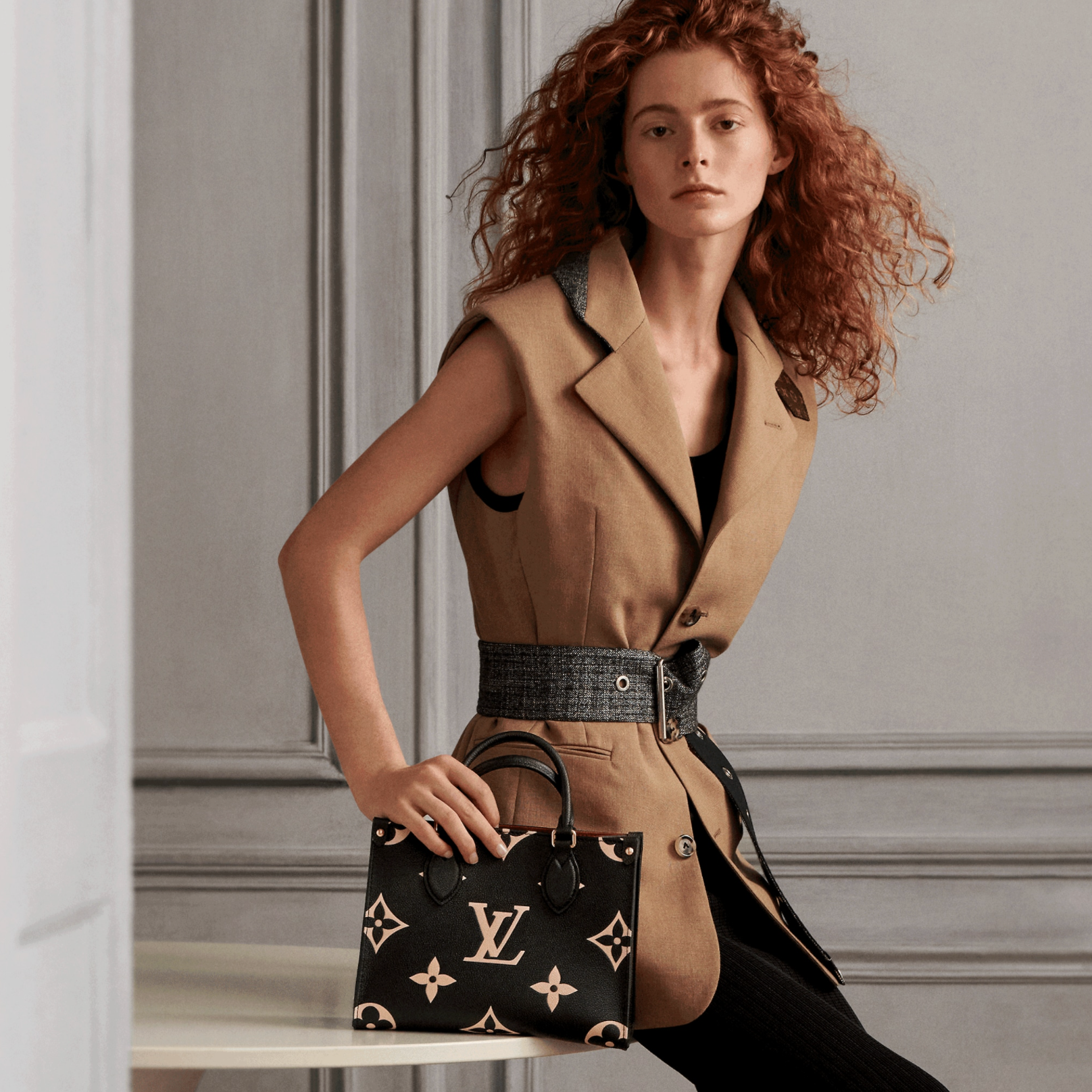 Black and Beige Embossed Grained Leather On-the-Go Tote Bag, PM Size